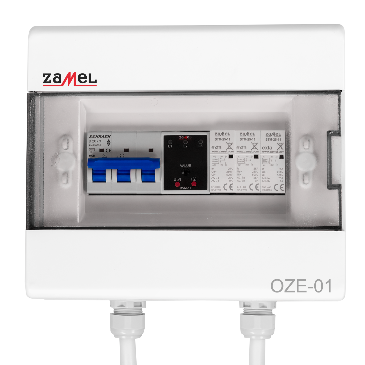 Urządzenie uruchamia obciążenie wybranej fazy zasilania w momencie wykrycia zbyt wysokiej fazy napięcia. Dzięki niezależnej analizie każdej z faz oraz niezależnym wyjściom, OZE-01 reaguje zawsze tam, gdzie jest potrzebne.